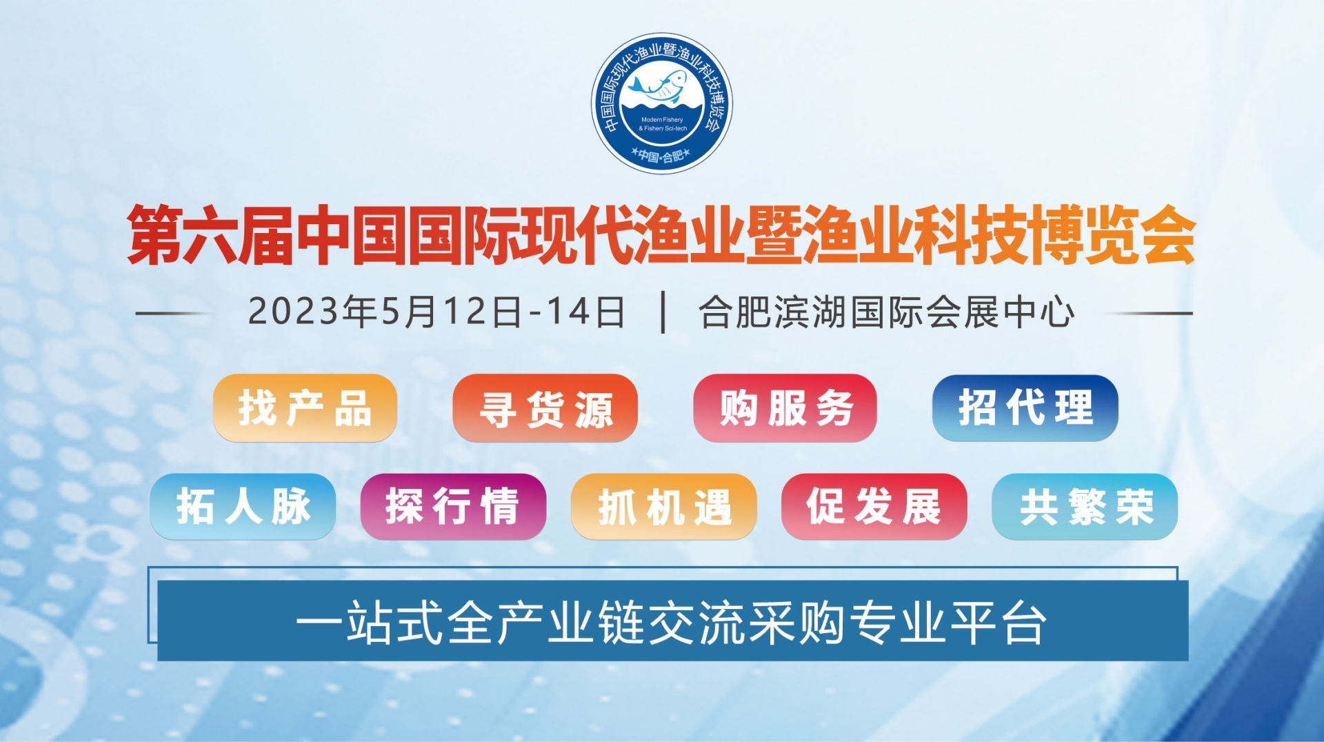 第六届中国国际现代渔业暨渔业科技博览会将于2023年5月12日-14日在安徽合肥举行,面积约33000平方米,预计参展企业800多家。博览会以“创新驱动、科技引领、绿色发展”为主题,以成果交易、品牌建设、评奖与表彰为亮点,促进品牌宣传、行业交流和产业发展。国家四大渔业主管部门联合支持,全国20多个省市渔业协会联动,最新渔业科技成果展示,上百家媒体宣传报道。